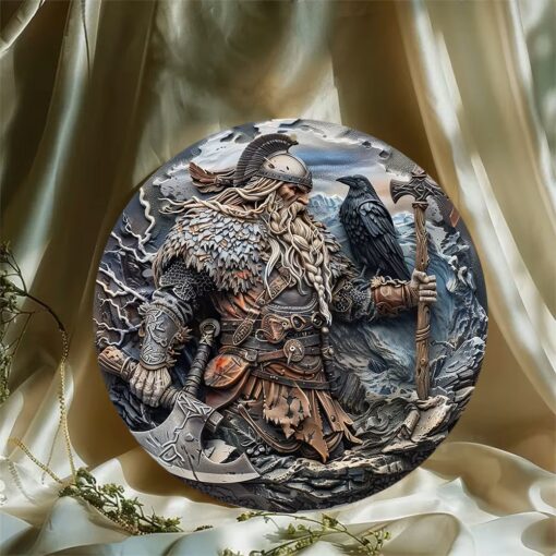 Tato dekorace zobrazuje stojícího vikingského válečníka se sekyrou a havranem na paži.