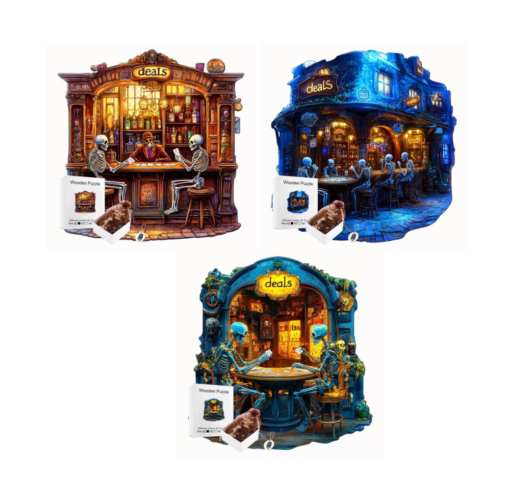 Tento komplet představuje originální dárek pro dospělé, kteří oceňují vtip a kreativní činnost. Vtipný obraz na stěnu v podobě barových scén s kostrami nabízí cestu, jak překvapit přátele něčím skutečně výjimečným. Dřevěné puzzle Kostry v baru vynikají svou nápaditostí a vybočují z řady běžných, masově vyráběných papírových produktů. Originální puzzle ze dřeva navíc motivují ke společnému skládání, čímž vznikají hodnotné společné zážitky u jednoho stolu. Smysluplné trávení času nad skládačkou s kostrami posiluje trpělivost a přináší hluboký pocit uspokojení z dokončeného díla.