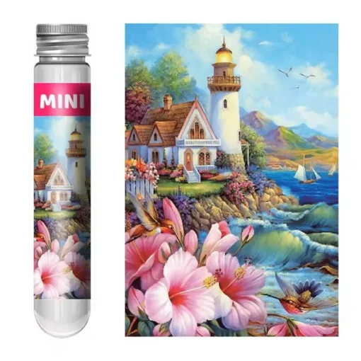 Mini puzzle ve zkumavce Maják s květy přinášejí kouzelný pohled na malý maják stojící na útese, který je obklopený nádhernými květy. Jemný a pohádkový motiv potěší všechny, kdo milují romantické a snové obrázky.